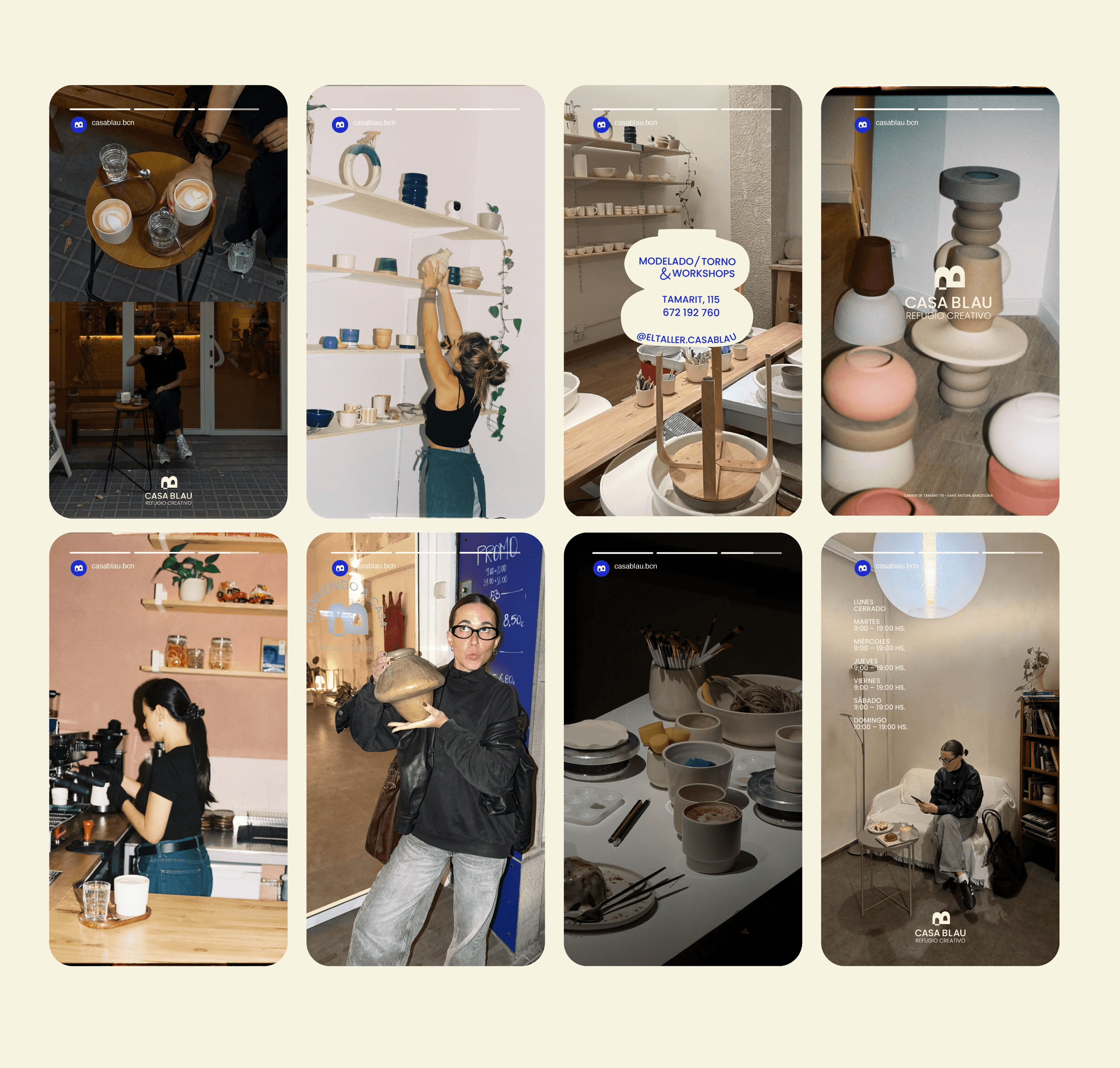 Casa Blau is a creative space located in the heart of Barcelona’s Eixample district, a ceramic studio, café, and community hub set to open in July 2025. We manage its digital presence end-to-end: monthly content creation, reels and imagery production, visual strategy, and social media management, helping strengthen its connection with the community while conveying the warm, handcrafted essence of the project.